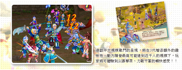 承襲了系列特色的連擊戰鬥玩法,3代在連擊戰鬥上,將使玩家能更容易達成連擊效果。而連續打擊敵人造成的加乘威力,配合『祕邑強化』、『武學加乘』、『隱藏神兵』的連鎖運用,傷害力輸出將可能衝破六位數!!瞬間扭轉戰局、明快克敵制勝,連擊玩法將更加刺激!! |
