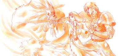 | ▲在古木森林裡,血獅鷲傭兵團擊退了兩度阻擋的杉福王國巡防隊, 卻不幸遇上了強力怪物的襲擊。血獅鷲傭兵團與怪物奮戰的同時, 一位謎般的少女出現在眾人面前。正當傭兵團成員對於她的出現訝 異不已的同時,她對克荷林說了一句意義深遠的話:「終於... 找到你了...」 |