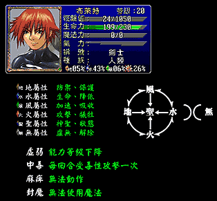 魔法中的四屬性地、水、風、火,四種屬性相生相剋在攻擊上會有加重、抵抗、吸收三種情形,在一代,屬性的數值能抵抗魔法,但在《幻世錄2—魔神戰爭》加重、抵抗、吸收三種情形會影響到戰鬥的結果,另外還有四狀態中毒、衰弱、封魔、麻痺,也會影響到戰鬥的過程,要特別注意喔!